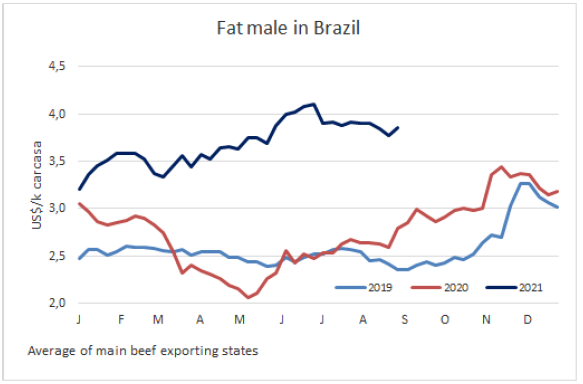 埃及進(jìn)口商繼續(xù)減少向巴西的牛肉采購量。一位巴西出口商表示,工廠正在試圖穩(wěn)住育肥牛價格的回落,看看前部位肉和后部位肉的銷售是否能更平衡一些。另一個阻礙新業(yè)務(wù)發(fā)展的因素是,通常在月初巴西國內(nèi)市場堅挺,加之下周二(7日)是獨(dú)立日假期,市場表現(xiàn)更為堅挺。