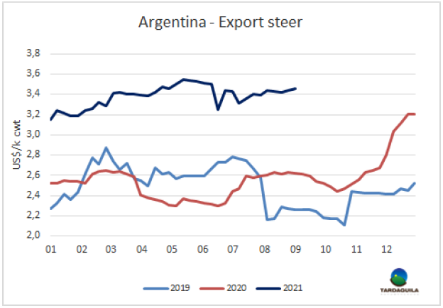 七月南美牛肉產(chǎn)品平均離岸價格5457美元/噸,達(dá)2011年11月至今十年以來最高。與去年七月相比,平均價格上漲了1285美元/噸,上漲了31%。今年前七個月南美國家牛肉出口平均價格4832美元/噸,較2020年的4492美元/噸上漲了8%。南美四國牛肉供不應(yīng)求,價格強(qiáng)勁上漲。其中價格上漲最明顯的是實行出口限制的阿根廷,部分原因是配額產(chǎn)品的出口占比增大,配額產(chǎn)品平均價格較高。當(dāng)然還有政府管控后“地下合同”減少的原因。四月阿根廷平均出口價格4072美元/噸,是南美地區(qū)最低,七月阿根廷平均出口價格達(dá)5389美元/噸,三個月內(nèi)增長了32%。同期內(nèi),烏拉圭牛肉價格上漲了11%,巴西牛肉價格上漲了14%,巴拉圭價格上漲了15%,烏拉圭仍然是南美牛肉價格最高的國家,七月平均價格達(dá)5891美元/噸。