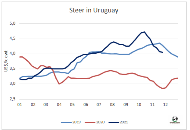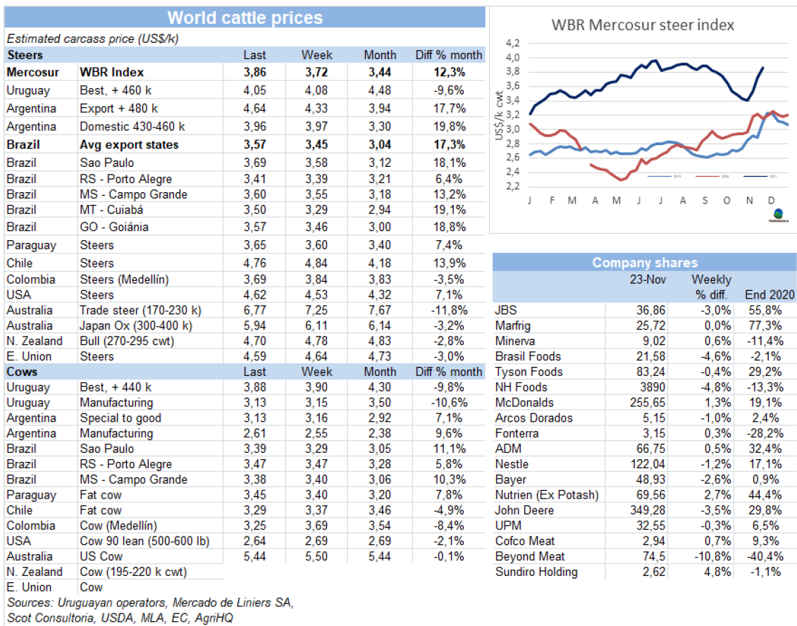 本周南方共同市場閹牛價格指數(shù)再次強勁上漲,達3.86美元/公斤,較上周上漲了14美分,達九月初以來最高水平。本周的上漲主要受到巴西和阿根廷牛價上漲的支撐,阿根廷育肥閹牛價格上漲至南美地區(qū)最高水平,本周參考價4.64美元/公斤,較上周上漲了31美分,較十月中旬累計上漲了87美元/公斤。巴西牛價繼續(xù)強勁恢復,但仍未南美地區(qū)牛價最低的國家,盡管巴西雷亞爾貶值2.1%。巴拉圭牛價繼續(xù)上漲,本周上漲了5美分至3.65美元/公斤。烏拉圭方面情況相反,盡管牛價急劇下行的趨勢已經(jīng)結(jié)束,但特種閹牛價格在4.05美元/公斤上下波動。