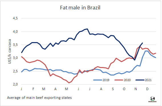 9-10月受對中國出口暫停影響育肥牛價格急劇下降,本周牛價有所恢復。根據(jù)應用經(jīng)濟學高級研究中心的數(shù)據(jù),雖然中國對巴西牛肉的禁運仍未取消,但截至11月17日,圣保羅育肥牛價格上漲了18.6%,達304.80雷亞爾/15公斤,本周大多數(shù)成交價320雷亞爾/15公斤。Cepea的研究人員稱,雨季有利于牧草漲勢,農(nóng)民選擇壓欄。10月29日,育肥牛成交價為257.10雷亞爾/15公斤,較9月3日下跌了16%,9月3日是向中國市場出口中斷前的最后一天。昨天巴西主要出口州育肥牛均價281.5雷亞爾/15公斤,較上周上漲了14雷亞爾/15公斤,較三周前上漲了40雷亞爾/15公斤,漲幅達17%。預計昨天中國接受9月4日前取得衛(wèi)生證的產(chǎn)品申報的消息發(fā)布后,市場將有樂觀轉(zhuǎn)變,活牛市場和牛肉批發(fā)市場的上行趨勢將有所持續(xù)。