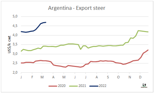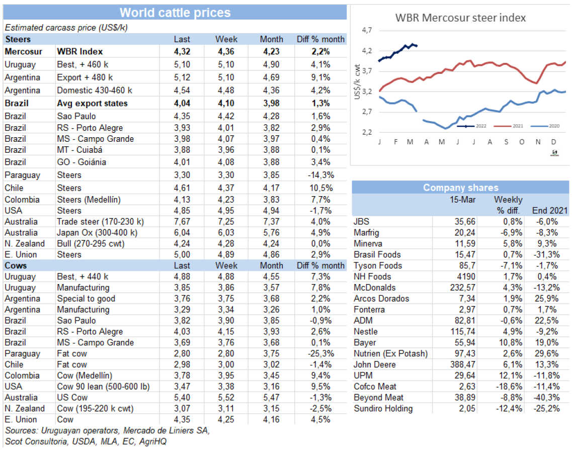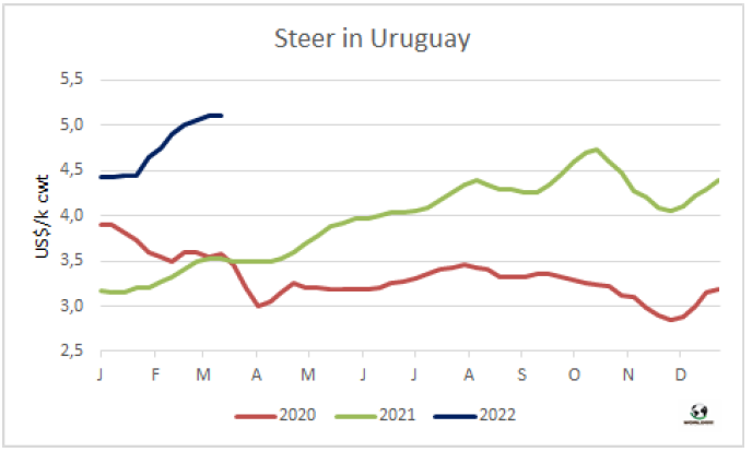 上周屠宰量受到24小時罷工影響。烏拉圭肉協(xié)統(tǒng)計截止3月12日當周牛屠宰量51784頭,盡管屠宰量仍高于五萬頭,但較上周有10%的降幅,是今年以來首次屠宰量同比下降。閹牛屠宰量下降最為顯著,較上周下降了3715頭至25258頭。小母牛屠宰量下降了1645頭至5908頭,母牛屠宰量僅較上周下降了692頭至19327頭。屠宰活動最活躍的工廠是Las Piedras(379廠),屠宰量4894頭,Minerva Pulsa(7廠) 屠宰量3925頭, 其次是Minerva Canelones(8廠)屠宰量3892頭。Marfrig四家屠宰廠屠宰量12424頭,較上周下降了2920頭,美麗華三家屠宰場屠宰量11237頭,較上周減少了288頭。3月前12個工作日牛屠宰量共計99980頭,較2021年同期減少了0.4%,主要是閹牛屠宰量減少了5.3%,小母牛屠宰量減少了11.2%,母牛屠宰量增加了10.2%,閹牛中只有2-4顆齒閹牛屠宰量增長了7.1%。
