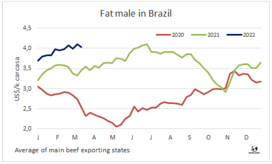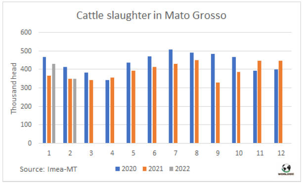 馬托格羅索州是巴西存欄最大的州,2月牛屠宰量和1月相比下降了8.2萬頭(-19%),同比也下降了 3000頭,屠宰量連續(xù)三個月的增長結(jié)束。Agrifatto稱,屠宰量下降的主要原因是公牛屠宰量較1月份下降了26.6%,只有18.36萬頭,是35個月來最低。該咨詢公司推測,屠宰量下降可能由于去年9月對中國出口暫停以及2021年最后一個季度待宰牛價格下降導致育肥進程減緩。母牛屠宰量較上月減少8.6%,為16.47萬頭,母牛屠宰量在中占比增加到47.3%,為24個月來的最高水平。然而這些數(shù)據(jù)本身并不意味著今年待宰牛供應增長趨勢的逆轉(zhuǎn)。