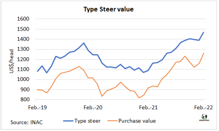 INAC把一頭體重480公斤,出成率54%的牛的銷售價值成為閹牛類型價值,2月該指數(shù)達到了歷史新高1470美元,較上月增加81美元。INAC表示,環(huán)比的增長是由于“出口部位肉和到國內(nèi)市場的東西銷售價值增長,部分抵消了內(nèi)臟和副產(chǎn)品價值的下降,而鮮皮的價格保持穩(wěn)定?!北驹禄钆2少弮r格上漲了105美元,達1264美元,因此工業(yè)增加值(兩者之間的差額)收縮至206美元/頭,僅為閹牛類型價值的14%。