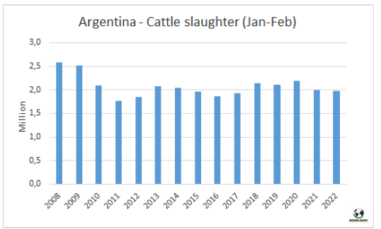 據(jù)農(nóng)業(yè)部估算,今年2月阿根廷牛肉產(chǎn)量23.2萬噸,2022年前兩個月產(chǎn)量合計45.4萬噸。單月看有所差異,但1-2月合計牛肉生產(chǎn)量與去年同期持平。2月人均消費量51公斤,1-月人均消費量48公斤,比2021年同期增長8%。