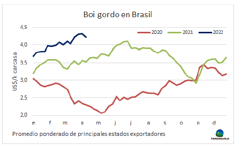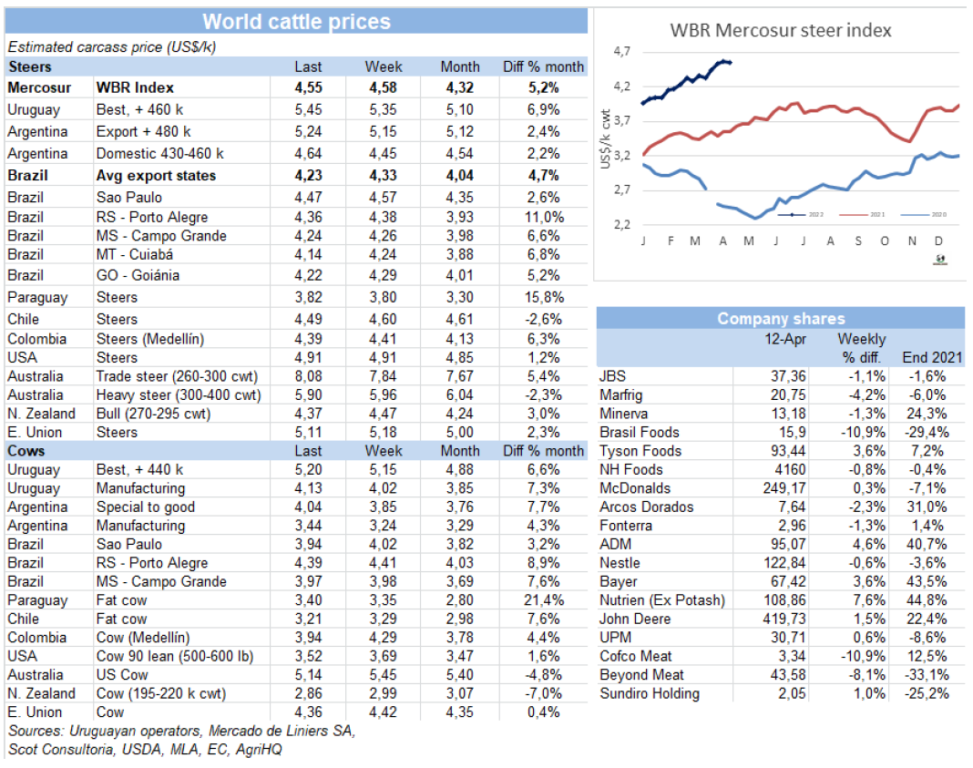 巴西牛肉出口平均價(jià)格持續(xù)上漲。 外貿(mào)部報(bào)告顯示,四月前六個(gè)工作日巴西牛肉出口量48148噸,平均價(jià)格6159美元/噸。平均單日出口量8025噸,較去年四月增長(zhǎng)了28%。平均出口價(jià)格同比增長(zhǎng)了29%,較今年3月增長(zhǎng)了22%。近幾周巴西對(duì)中國(guó)出口價(jià)格下降,我們將看到出口平均價(jià)格下降。