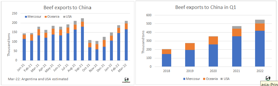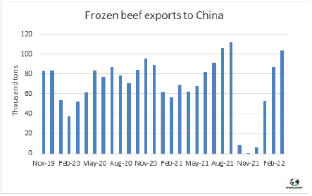 三月主要出口國(guó)對(duì)中國(guó)市場(chǎng)牛肉出口量超20萬(wàn)噸,僅在去年八月和九月出口量超過(guò)該數(shù)量。巴西的發(fā)運(yùn)量強(qiáng)勁是主要原因,從烏拉圭、澳洲的發(fā)運(yùn)量也很大。2022年第一季度,向中國(guó)出口牛肉的全球主要牛肉供應(yīng)國(guó)出貨量約為21.2萬(wàn)噸,僅低于2021年9月的紀(jì)錄。出口量同比增長(zhǎng)16%(約7.6萬(wàn)噸)。