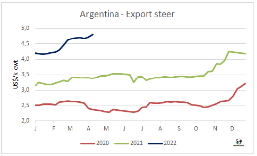 供應(yīng)短缺和價(jià)格普遍上漲繼續(xù)推高出口閹牛價(jià)格。上周牛價(jià)上漲了10-15比索,自今年年初以來(lái),累計(jì)上漲了90-110比索。英國(guó)純種閹牛參考價(jià)530-545比索之間,比今年年初上漲了25%,而瘤牛雜交品種的價(jià)格上漲到490-510比索/公斤,今年迄今為止上漲了21%。特優(yōu)母牛供應(yīng)稀缺,上周價(jià)格上漲了20比索至460-480比索/公斤,與3個(gè)月前相比累計(jì)上漲了31%。主要賣到中國(guó)市場(chǎng)的工業(yè)母?,F(xiàn)在的價(jià)格約為420-430比索/公斤,比2022年初上漲了27%。