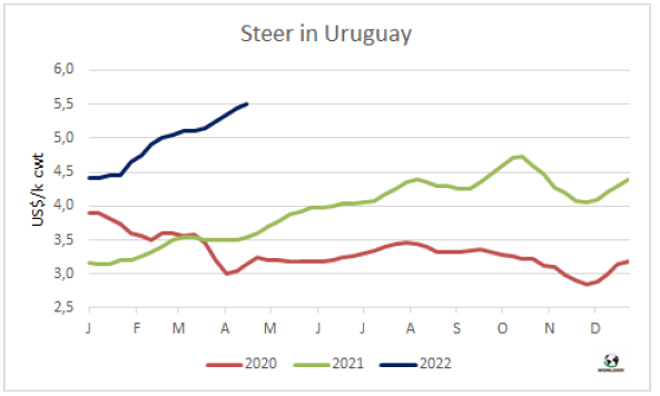 2022年第一季度,活牛出口僅5000頭,達(dá)2012年以來(lái)最低水平。但考慮到中國(guó)和土耳其這兩個(gè)主要的進(jìn)口國(guó)采購(gòu)興趣增長(zhǎng),行業(yè)普遍預(yù)計(jì)貿(mào)易流在接下來(lái)幾個(gè)月有所好轉(zhuǎn)?;钆YQ(mào)易少的主要原因不是缺乏需求,而是受育肥牛價(jià)格高的拉動(dòng),國(guó)內(nèi)市場(chǎng)出價(jià)較高。出口土耳其市場(chǎng)的知情人士稱(chēng)正在采購(gòu)未來(lái)船期的訂單,采購(gòu)興趣主要集中在280公斤以下的乳齒閹牛,成交價(jià)2.8美元/公斤。土耳其方面,2020年宣布的從今年開(kāi)始停止進(jìn)口育肥用活牛的計(jì)劃被擱置。美國(guó)農(nóng)業(yè)部駐安卡拉辦事處預(yù)計(jì),由于飼養(yǎng)場(chǎng)牲畜短缺,今年進(jìn)口牲畜的數(shù)量將增加30%,達(dá)34萬(wàn)頭。對(duì)中國(guó)的出口需求也再次顯現(xiàn)。今年4月,海關(guān)報(bào)告了7000頭母牛的需求,5月同樣有7000頭肉母牛和乳母牛的需求即將發(fā)運(yùn)。市場(chǎng)參與者反映,每頭懷孕小母牛的出口收入高達(dá)800美元,每頭重達(dá)250公斤的小母牛的出口收入高達(dá)550美元。過(guò)去12個(gè)月里,烏拉圭出口了約20萬(wàn)頭活牛,較2021年底的26萬(wàn)頭相比大幅下降??紤]到采購(gòu)方興趣改善的預(yù)期,未來(lái)幾個(gè)月跌勢(shì)將有所減弱或趨于穩(wěn)定。