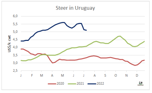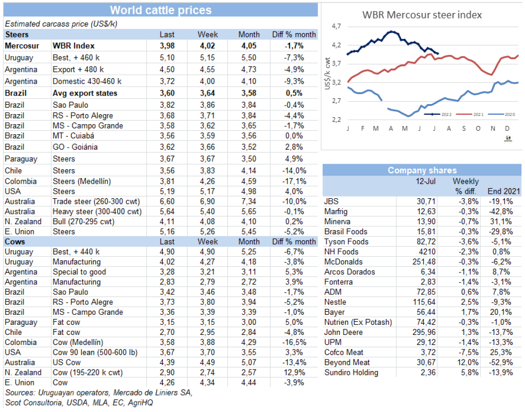 五家工廠暫停屠宰活動加上一些還在進行屠宰活動的工廠減產,導致牛屠宰量下降至2020年末至今一年半以來的最低水平。烏拉圭肉協(xié)報告,截止7月9日,一周內牛屠宰量29829頭,環(huán)比減少了1萬多頭,減幅約25%。同比減少了2.1萬頭,減少了42%。屠宰量較上周下降是由于閹牛屠宰量下降了約28%至14561頭,母牛屠宰量較上周下降了17%至10506頭。小母牛屠宰量下降了17%至4297頭。屠宰量最高的工廠是Las Piedras,379廠,屠宰量 5022頭, Marfrig-Cledinor,394廠,屠宰量 3180頭和Ontilcor 439廠,屠宰量3,041頭。美麗華三家屠宰場屠宰量累計6553頭,Marfrig兩家屠宰場累計屠宰量5735頭。本周烏拉圭2廠,104廠等一些上周暫停的屠宰場恢復屠宰, 12廠,344廠,310廠仍未恢復屠宰。美麗華7廠屠宰持續(xù)至昨天,將暫停屠宰直至八月中旬。本周屠宰量將繼續(xù)保持低水平,不過將較前一周的低點有所提高。