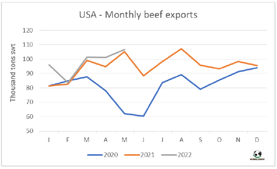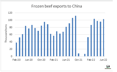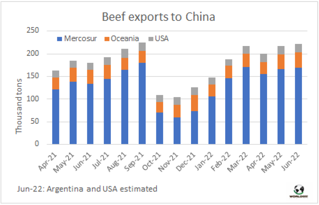 6月份,中國牛肉的主要供應國發(fā)船量仍然很大。據估計,南方共同市場、澳洲和美國牛肉出口量達22.1萬噸,非常接近2021年9月22.4萬噸的最高峰值。據估計從南方共同市場發(fā)貨量約17萬噸,其中從巴西發(fā)貨量超過10.3萬噸。此外,從澳洲發(fā)貨量3.3萬噸,從美國發(fā)貨量1.8萬噸,與3-5月的出貨水平相當。這些貨物量大多在7月下半月到8月之間抵達中國。