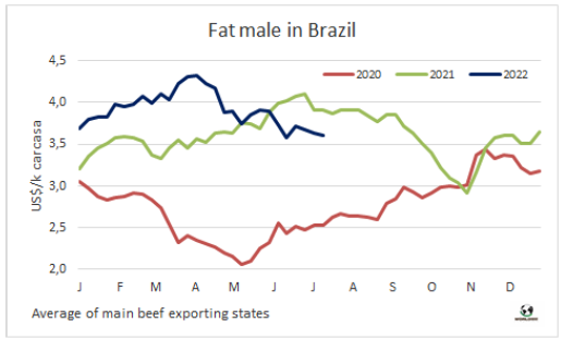 WBR南方共同市場閹牛價格指數本周下跌了4美分,自今年第一周以來首次跌破4美元。IFNM降至3.98美元/公斤。該指數下跌的原因是阿根廷、巴西和烏拉圭三國美元牛價下跌。巴西方面受匯率下降了0.9%影響,主要出口州美元牛價下跌了4美分至3.6美元/公斤。烏拉圭和阿根廷牛價糞便下跌了5美分至5.1美元/公斤和4.5美元/公斤。巴拉圭方面牛價穩(wěn)定在3.65-3.7美元/公斤。