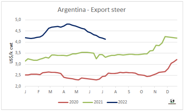2022年上半年,每頭牛平均屠宰重量231公斤,較2021年同期的228公斤有所增長,較2020年同期的平均屠宰體重增長了2公斤。公牛體重有所增長,母牛體重下降,尤其是大齡母牛。與去年相比,小閹牛和小母牛的屠宰量有所下降。2022年累計屠宰量數據中,閹牛占42%,小母牛占26%,去年同期閹牛屠宰量占44%,小母牛屠宰量占28%。