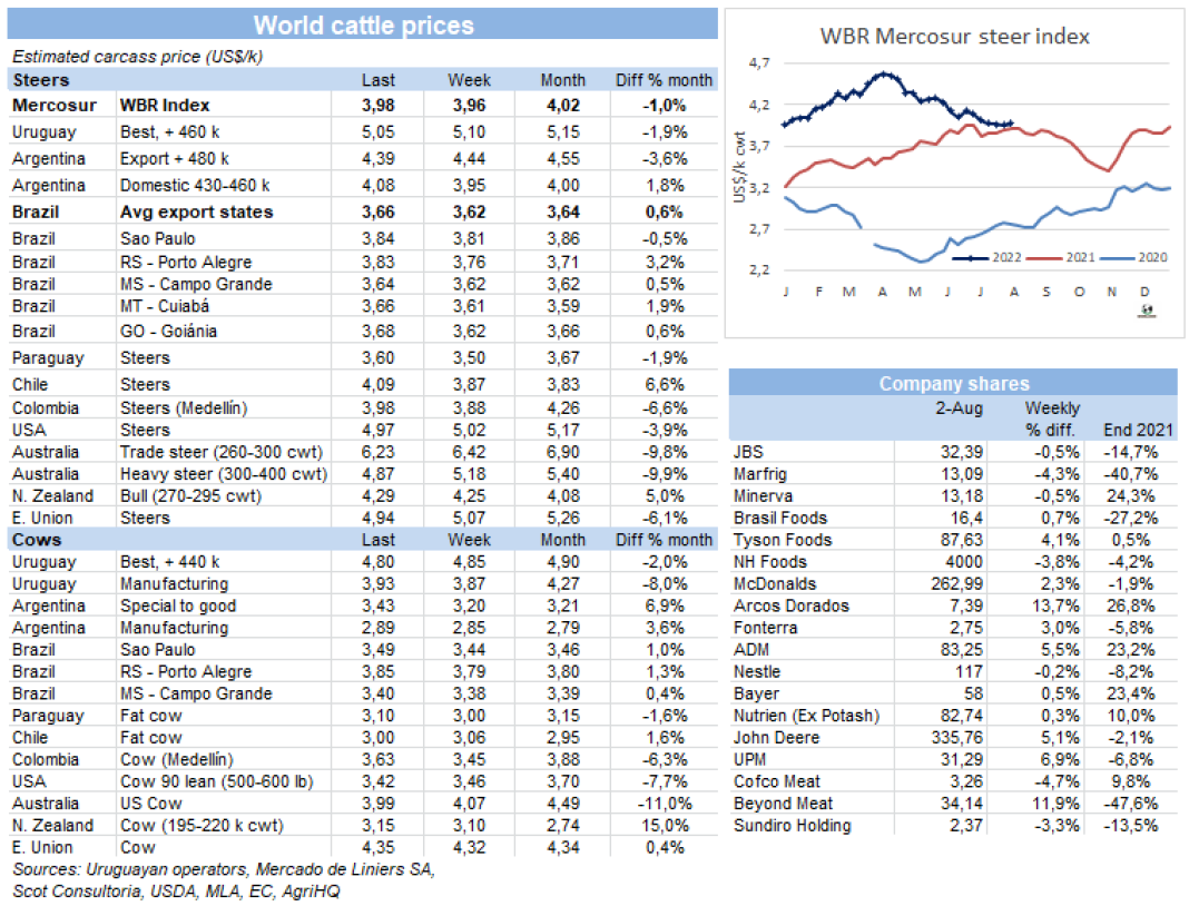 近兩周本周南方共同市場閹牛價格指數(shù)上漲了2美分,連續(xù)五周的下跌趨勢中止,本周該指數(shù)為3.98美元/公斤。主要原因是巴西匯率價格上漲,本周雷亞爾增值1.5%,巴西主要出口州美金計牛價上漲了4美分至3.66美元/公斤。巴拉圭待宰公牛價格上漲了10美分至3.6美元/公斤。阿根廷方面出口閹牛比索價格保持穩(wěn)定,隨著比索以每周1.2%的跌幅貶值,美金牛價下跌了5美分至4.39美元/公斤,含9%出口稅。烏拉圭方面需求仍然低迷,牛價下跌了5美分至5.05美元/公斤,市場價格差異仍然較大。