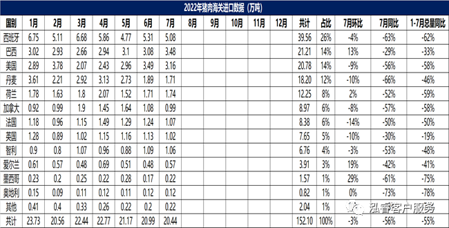 2022年7月豬肉進(jìn)口量20.44萬噸,環(huán)比減少3%,同比減少56%。1-7月豬肉進(jìn)口總量152.10萬噸,同比減少55%。從進(jìn)口國別看,7月豬肉進(jìn)口國主要集中于西班牙、巴西、美國、丹麥、荷蘭五國。其中,進(jìn)口西班牙豬肉數(shù)量最大,占7月進(jìn)口量的26%。進(jìn)口巴西和美國豬肉數(shù)量各占14%。