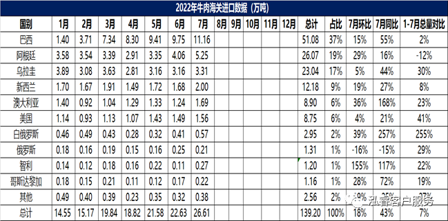 2022年7月中國主港牛肉進(jìn)口量26.61萬噸,環(huán)比增長18%,同比增長43%。1-7月牛肉進(jìn)口量累計139.2萬噸,同比增長7%。前五大進(jìn)口來源國分別為巴西、阿根廷、烏拉圭、新西蘭、澳大利亞,美國位居第六位。從第一大進(jìn)口來源國巴西的進(jìn)口量占總進(jìn)口量的37%。