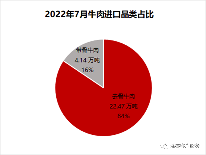 從牛肉進(jìn)口品項看,7月去骨牛肉進(jìn)口量22.47噸,占84%,帶骨牛肉進(jìn)口量4.14萬噸,占16%。