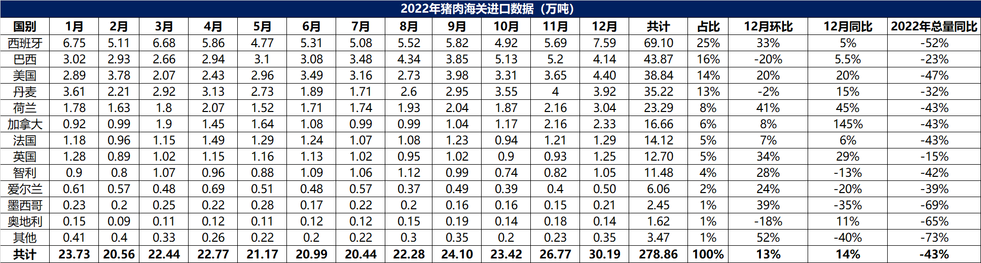 2022年12月中國主港豬肉進口量30.19萬噸,環(huán)比+13%,同比+14%。全年中國主港豬肉進口總量278.86萬噸,同比-43%。12月豬肉前四大進口來源國依然是西班牙、巴西、美國、丹麥,分別占當(dāng)月進口量的25%、16%、14%、13%。