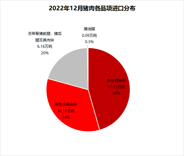 12月豬肉進口品項以骨類和其他帶骨豬肉為主,占進口量的46%;豬副產(chǎn)類占比34%;主塊肉和油脂類占比共計20%。