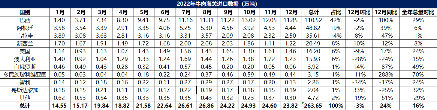 2022年1-12月中國主港牛肉進口量263.65萬噸,同比+16%。12月主港牛肉進口量23.82萬噸,同比+24%,環(huán)比-3%。2022年牛肉前十大進口來源國依次是巴西、阿根廷、烏拉圭、新西蘭、美國、澳大利亞、白俄羅斯、玻利維亞、智利、哥斯達黎加。