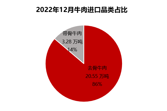 從進口品類看,12月去骨牛肉進口量20.55萬噸,占86%,帶骨牛肉進口量3.28萬噸,占14%。
