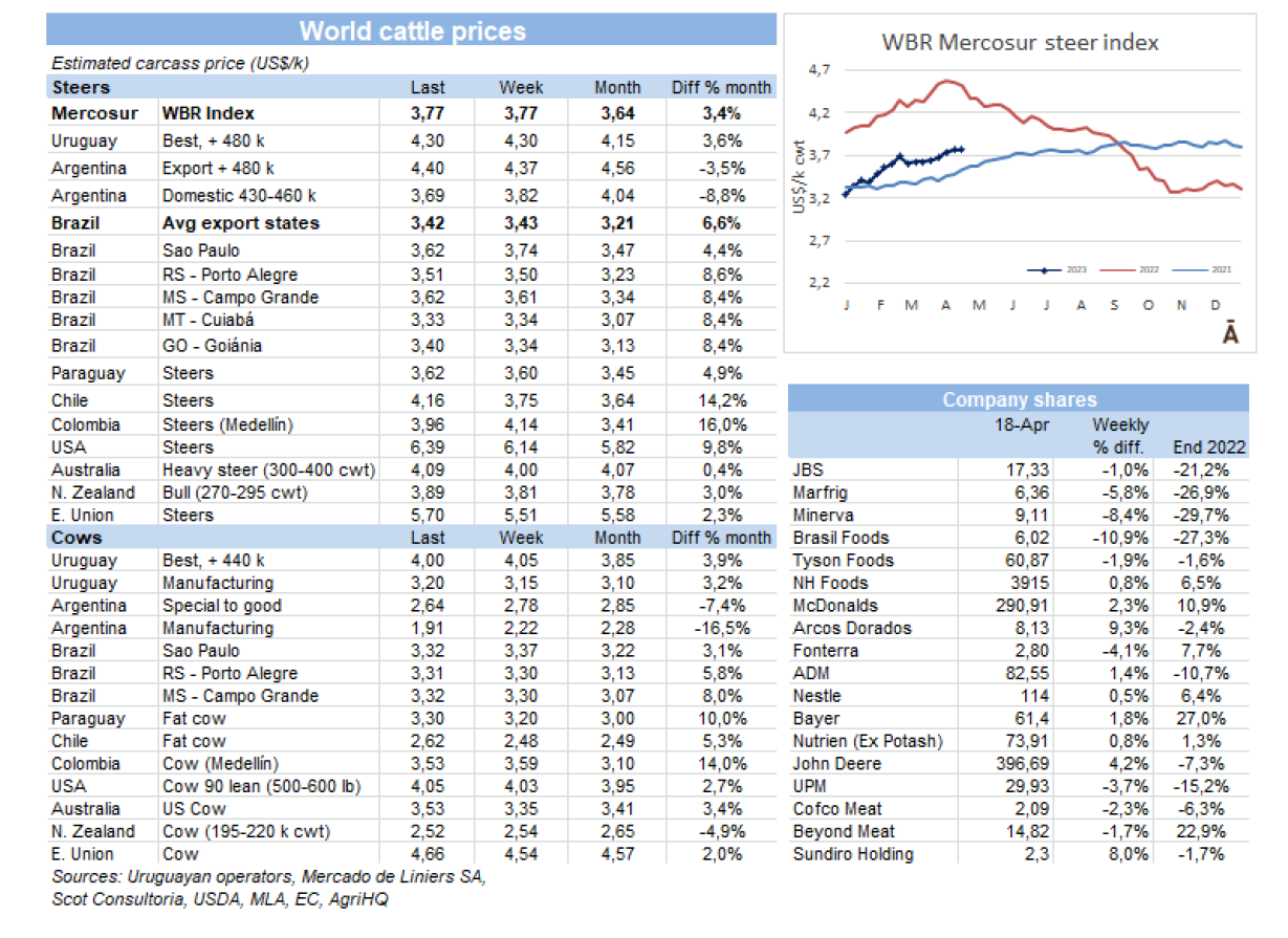 在巴拉圭,用于屠宰的雄魚本周從2美分上漲至3.62美元,而在烏拉圭,特殊牛種則保持穩(wěn)定在4.30美元每公斤。