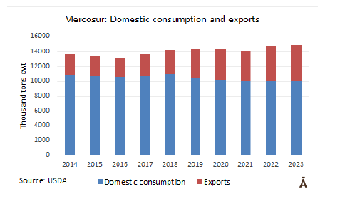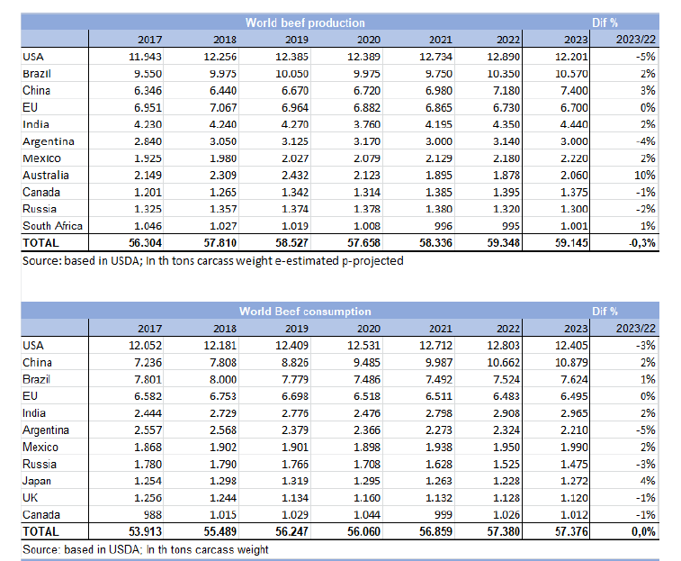 根據(jù)美國農(nóng)業(yè)部上周發(fā)布的預(yù)測,主要的牛肉出口商會保持其對國際市場的穩(wěn)定銷售量,一些國家的銷售量減少將被其他國家的增長銷量所抵消。三個主要出口國巴西、澳大利亞和印度將增加銷量,而其他國家(美國、阿根廷、烏拉圭、巴拉圭和新西蘭)將減少銷量,因此最終平均下來銷量與2022年非常相似。南方共同市場、大洋洲、北美和印度的總銷量約為1070萬噸,比去年增加6.7萬噸。