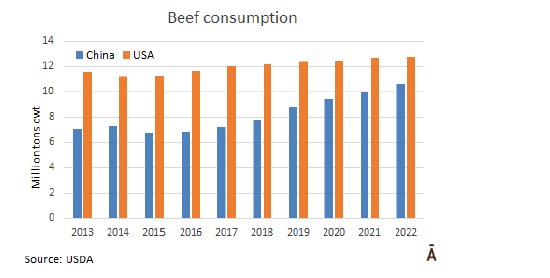 在過去八年中,中國牛肉消費(fèi)量從680萬噸增長到1090萬噸,增長了60%。中國消費(fèi)量快接近美國,而美國在此期間增長了10%,達(dá)到了1240萬噸。如果中國消費(fèi)量的這種擴(kuò)張趨勢繼續(xù)下去的話,在未來十年,中國將超過美國,不僅會成為世界主要的牛肉進(jìn)口國,而且還會成為主要的消費(fèi)國。根據(jù)美國農(nóng)業(yè)部的數(shù)據(jù)顯示,在2023年,中國的消費(fèi)量比美國少150萬噸;而2015年的消費(fèi)量則比美國少450萬噸。