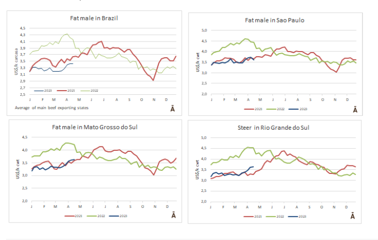 根據(jù)外貿(mào)部的報(bào)告,在4月的前9個工作日中,巴西累積出口了43,246噸牛肉,均價(jià)為$4629。日出口量為4,805噸,比2022年4月出口量減少了42%。