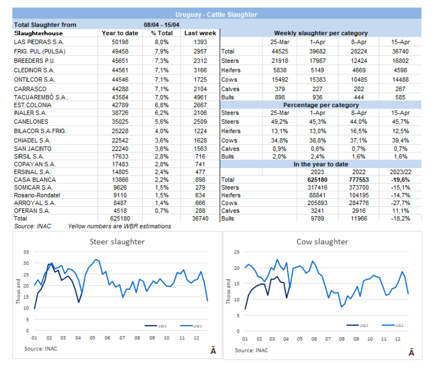 INAC報(bào)告說,有36740頭牛進(jìn)入工廠,其中16802頭是公牛(占總數(shù)的46%)和14488頭母牛(占總數(shù)的39%)。本周產(chǎn)量最高的工廠是Marfrig-Tacuarembó ,有4961頭牛在加工,遠(yuǎn)遠(yuǎn)超過Marfrig-Cledinor(3166頭)和Minerva-Pulsa(2957頭)。在這一周里,Marfrig屠宰了12900頭牛,Minerva屠宰了7570頭牛。4月上半月,屠宰了68019頭牛,比2022年同期減少了34%。