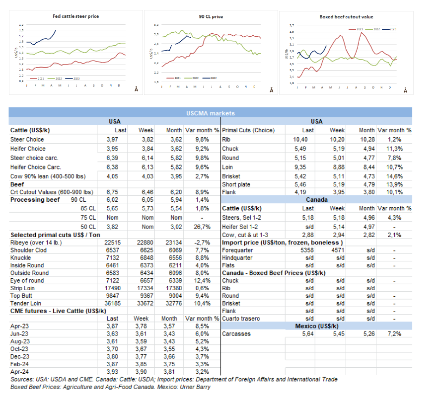 無論如何,價(jià)格沒有產(chǎn)生太大變化。前后腱$6800,板腱$5100,肋骨$5800,后部位肉$6000,80碎肉$3600。這些參考價(jià)格比3月底市場上的價(jià)格低約$100。一位實(shí)業(yè)家透露,鑒于最近幾周屠宰牛價(jià)格的上漲,他收到了中國出價(jià)$4000美金來收購一頭母牛四分體,并表示“這個價(jià)格讓人無法接受”。