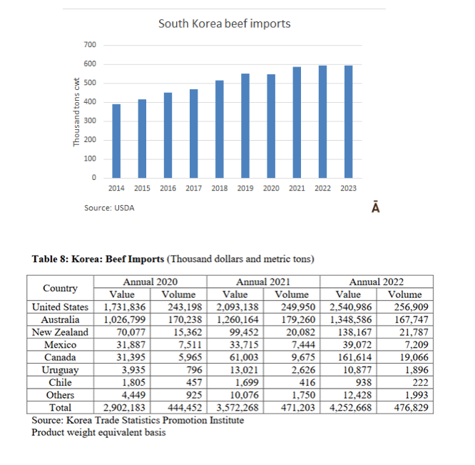 美國農(nóng)業(yè)部預(yù)計(jì)韓國2023年的牛肉進(jìn)口量為59.5萬噸,與2022年持平,比1月份的預(yù)測量低1.5萬噸。國內(nèi)供應(yīng)將增加近40噸達(dá)到37.9萬噸。