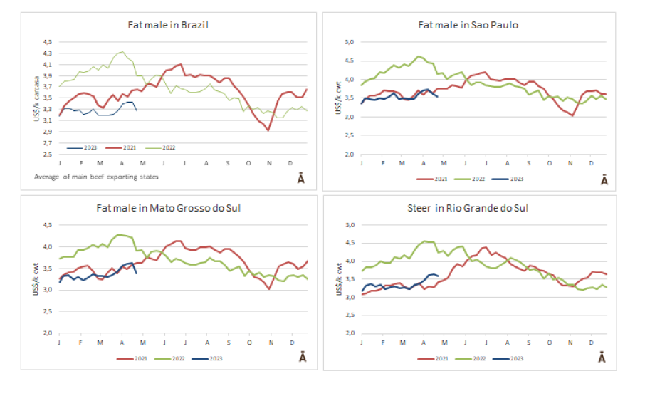 巴西主要養(yǎng)牛州的成品牛平均價(jià)格下跌$0.14,至$3.28/kg cwt,回到了3月底的低點(diǎn)。