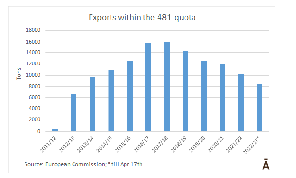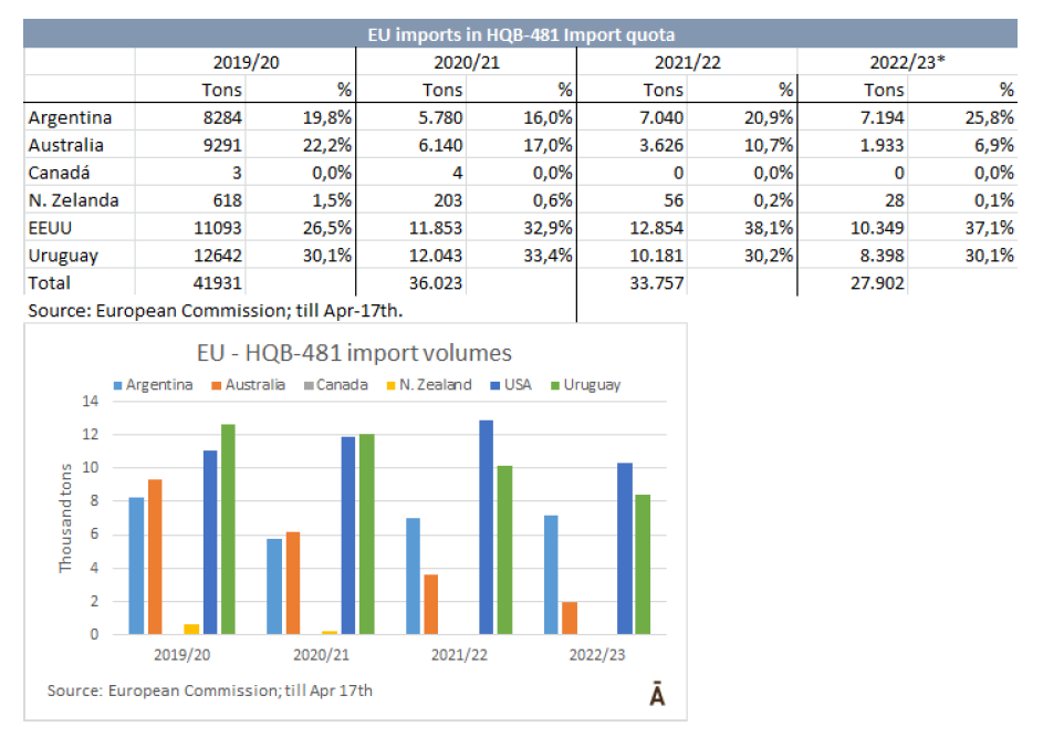 烏拉圭是第二大供應(yīng)國(guó),在2022-2023年度達(dá)到8,398噸,超過(guò)了阿根廷(7,194噸)和澳大利亞(1,933噸)。新西蘭和加拿大可以給481配額出口,但他們并沒(méi)有使用配額。