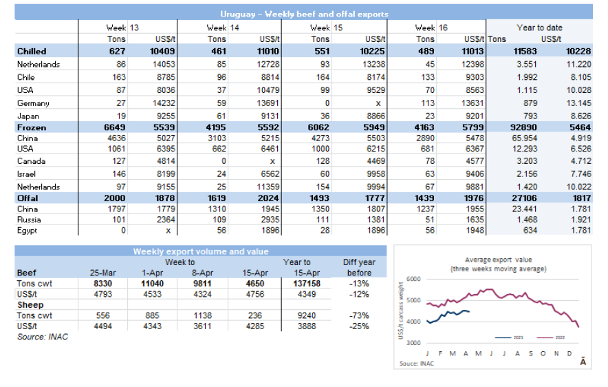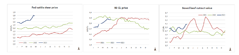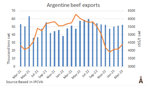 2023年前三個(gè)月,牛肉出口量達(dá)到15.6萬(wàn)噸,出口額為6.542億$,與上年同期相比增長(zhǎng)13.2%,出口額下降16.4%。本季度的出口量相當(dāng)于22.18萬(wàn)噸帶骨牛肉。