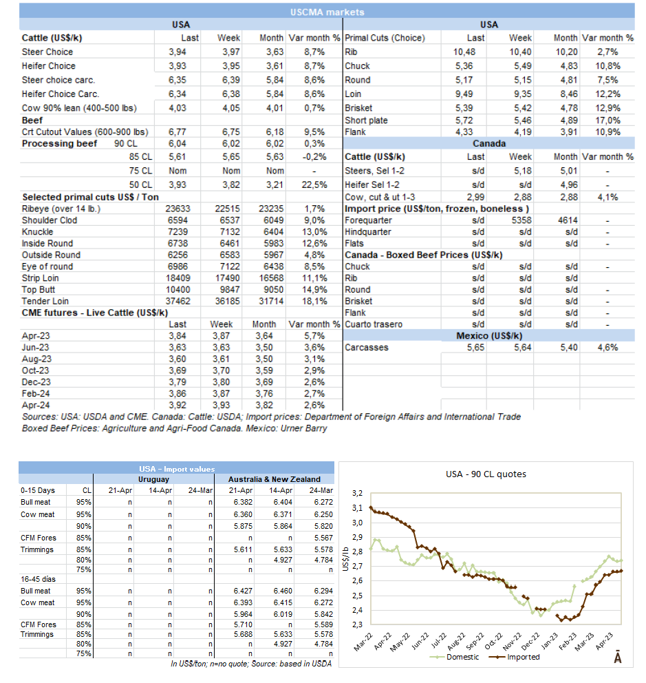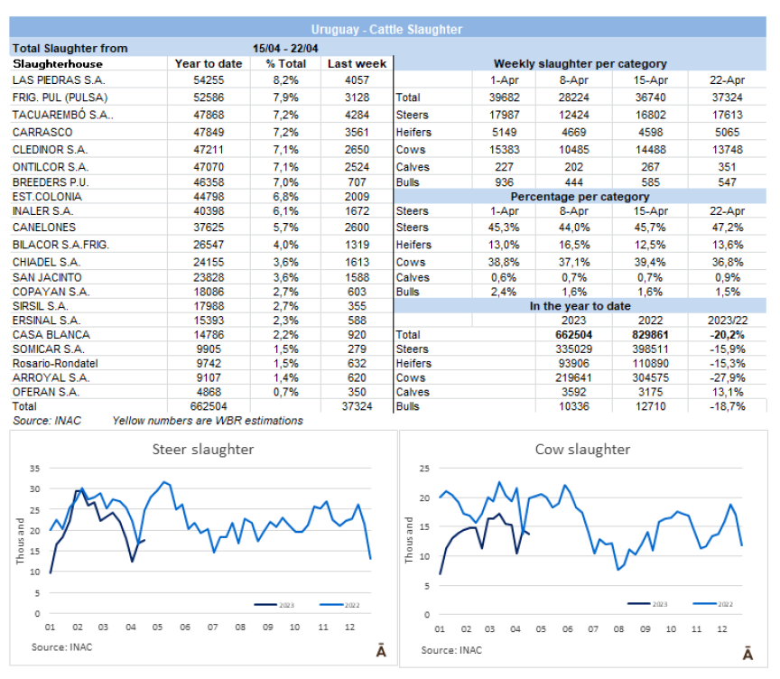 在僅剩的一周時(shí)間里,4月份累計(jì)只屠宰了105,343頭牛,因此該月傾向于以不到150,000頭動(dòng)物的加工量結(jié)束,在年度比較中減少了約65,000頭。這樣一來(lái),今年前四個(gè)月的牛屠宰量將剛剛超過(guò)70萬(wàn)頭,比2022年同期減少約18萬(wàn)頭(-21%)。
