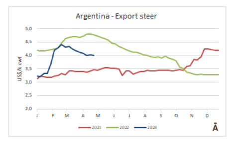 其他國(guó)家價(jià)格變化不大。阿根廷比出口閹牛由于貨幣貶值,因此出口牛的參考價(jià)格下降了$0.04,至$4.36/kg cwt。
