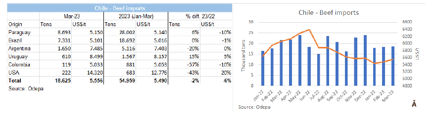 根據(jù)Odepa公布的數(shù)據(jù),智利在2023年前三個(gè)月進(jìn)口了54,959噸牛肉,均價(jià)為$5,490/噸。數(shù)量同比收縮2%,而價(jià)值中值下降6%。