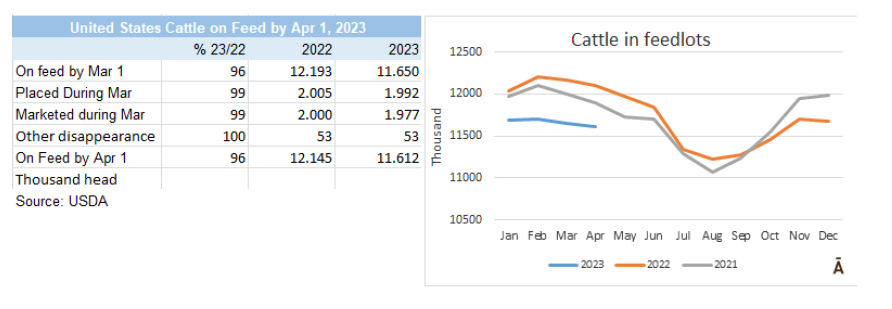 美國(guó)農(nóng)業(yè)部統(tǒng)計(jì)4月牛存欄量為1160萬(wàn)頭牛,同比去年下降了4.4%。3月期間的投放量共計(jì)199萬(wàn)頭,比去年低1%。3月期間飼用牛的銷(xiāo)售量總計(jì)198萬(wàn)頭,比2022年低1%。庫(kù)存包括712萬(wàn)頭閹公牛,同比下降6%,450萬(wàn)頭小母牛,同比下降2%。