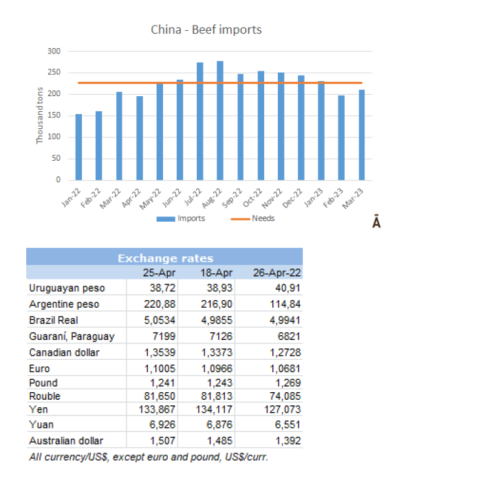 根據(jù)中國(guó)海關(guān)的數(shù)據(jù)表示,中國(guó)3月份進(jìn)口了211,000噸牛肉,今年第一季度共進(jìn)口了639,000噸。按照美國(guó)農(nóng)業(yè)部2023年進(jìn)口預(yù)期所需的進(jìn)口量(每月約22.7萬(wàn)噸),2023年第一季度,赤字約為4.2萬(wàn)噸。