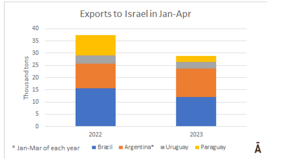 今年頭幾個月,南方共同市場國家對以色列的牛肉出口縮減了24%。考慮到1月-4月間巴西、烏拉圭和巴拉圭的出口量,加上第一季度阿根廷的出口量,今年的出貨量為28,512噸,比2022年同期的37,452噸少了近9,000噸。