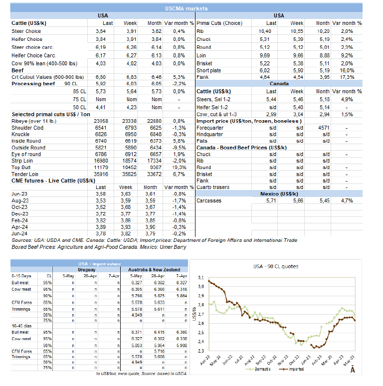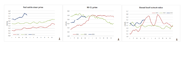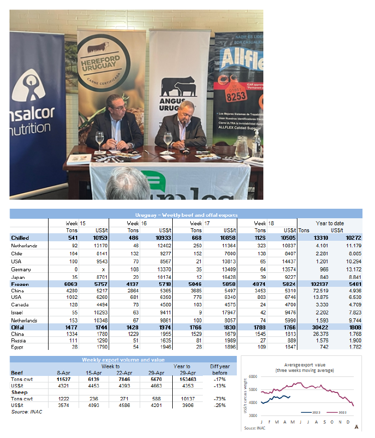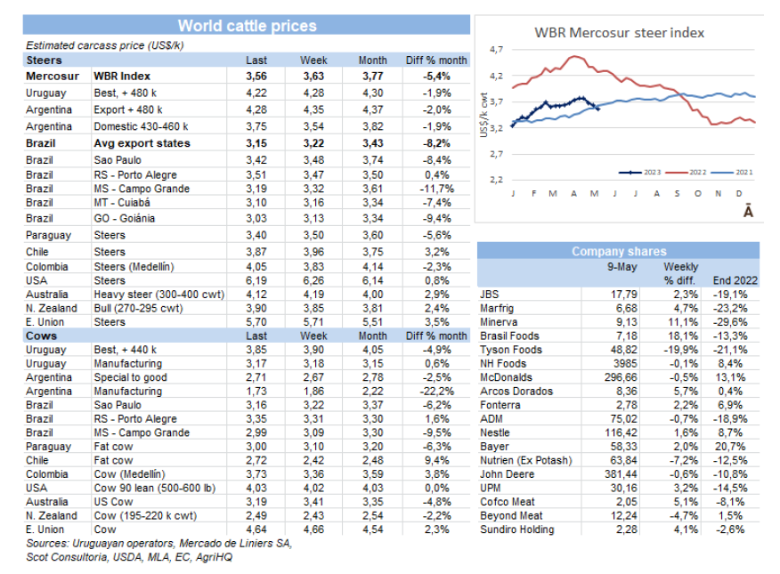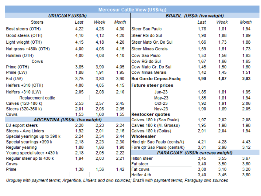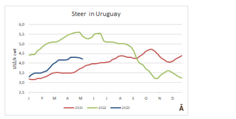 在烏拉圭,盡管供應短缺,但價格仍在下降。出口公牛的參考價格在每公斤4.22美元。