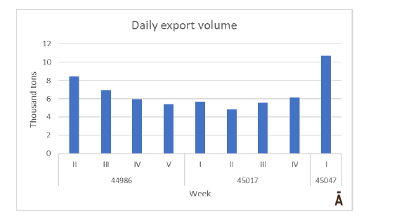 3月所有四個主要市場(日本、韓國、美國和中國)的出口量都很相似,4月份中國成為最大的客戶,出口了16,745噸。