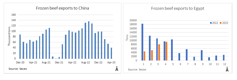 4月份中國的牛肉出口商出貨量略高于15萬噸,比3月份少了約3萬噸,這是2021年12月以來的最低月度出貨量。當時巴西因9月份發(fā)現(xiàn)兩例非典型瘋牛病而開始暫停出口?,F(xiàn)在,由于巴西在3月23日之前出于同樣的原因暫停出口一個月,其主要供應商在3月下半月和4月上半月的出貨量受到極大影響。