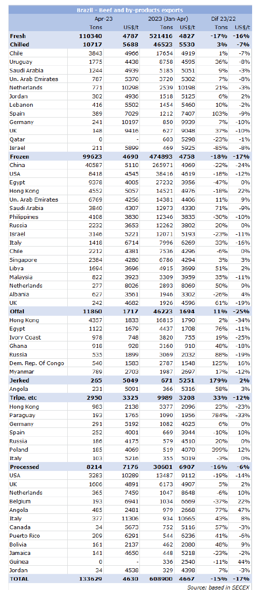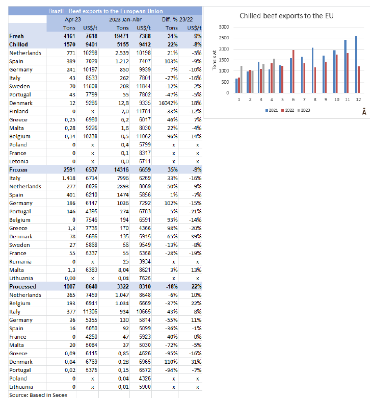 1月至4月期間,巴西向歐盟國家出口了19,471噸冰鮮牛肉,比2022年同期增長31%。增長的主要是冰鮮肉(增長22%至5,155噸)和冷凍肉(增長35%至14,316噸)。