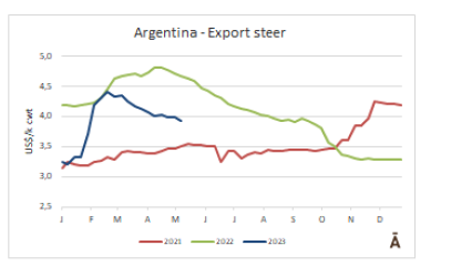 在阿根廷,以阿根廷比索計算的出口指導價保持了上周的價格,下跌7美分,至每公斤4.28美元。