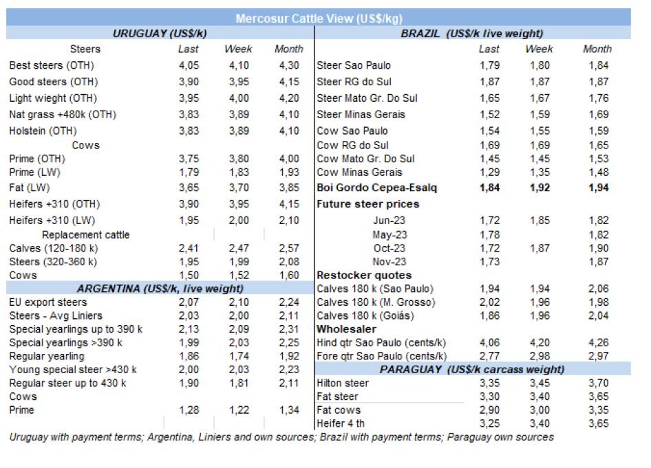 一家經(jīng)營(yíng)智利市場(chǎng)的代理商的表示智利的進(jìn)口市場(chǎng)仍然疲軟。有一些進(jìn)口商進(jìn)行了 "短期采購(gòu)",用$5,700(CIF價(jià)格)購(gòu)買了巴西的19分體,用$5,200-$6,000(CIF價(jià)格)購(gòu)買了巴拉圭的19分體。同時(shí),巴西牛前價(jià)格為$5,100,巴拉圭牛前為$5,200-5,300,這批貨物將在6月底左右到達(dá)。