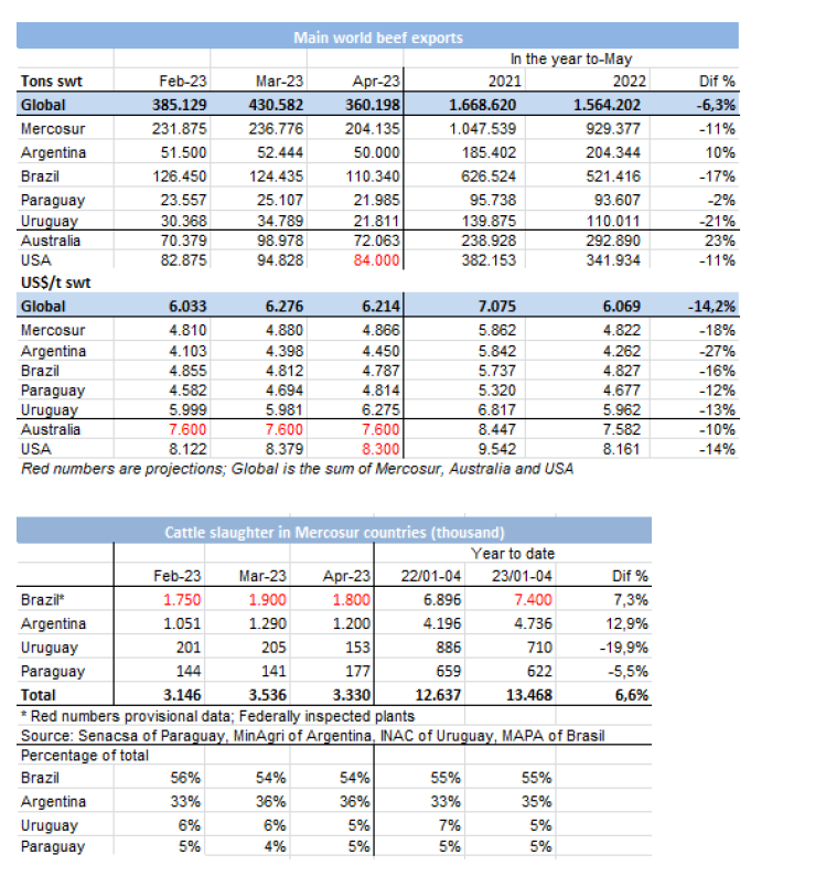 在2023年前四個(gè)月,牛肉出口總量為21萬(wàn)噸(產(chǎn)品重量),價(jià)值接近8.95億美元,這一數(shù)字意味著數(shù)量上同比增長(zhǎng)13.4%,同時(shí)貨值下降17.3%,中國(guó)占了發(fā)貨量的77.4%。去年(從2022年5月至2023年4月),肉類出口總量為65.8萬(wàn)噸產(chǎn)品重量(相當(dāng)于938,500噸帶骨牛肉),價(jià)值接近32.73億美元。
