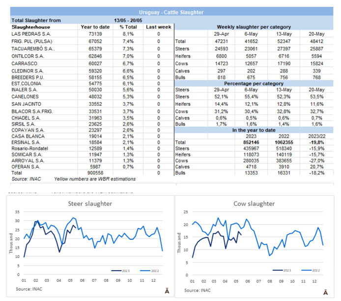 2023年累計(jì)烏拉圭的牛屠宰量為852,201頭,與去年同期相比減少了19.4%。