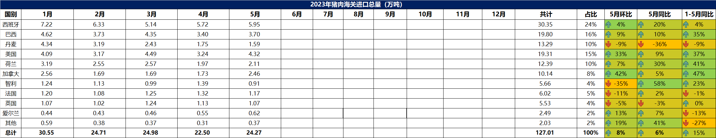 2023年5月中國主港豬肉進口量24.27萬噸,環(huán)比增加8%,同比增加6%。1-5月主港豬肉進口總量127.01萬噸,同比增加15%。從進口國別看,5月豬肉進口主要國別依然是西班牙、巴西、美國、丹麥和荷蘭,進口量之和占比超過70%。