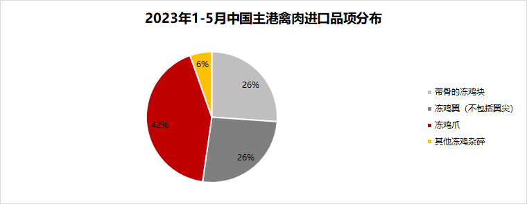 從進口品項看,凍雞爪、帶骨的凍雞塊、凍雞翼(不包括翼尖)為主要進口品類。其中1-5月凍雞爪進口量23.8萬噸,凍雞翼(不包括翼尖)進口量14.70萬噸,帶骨的凍雞塊進口量14.66萬噸,其他凍雞雜碎進口量3.02萬噸。